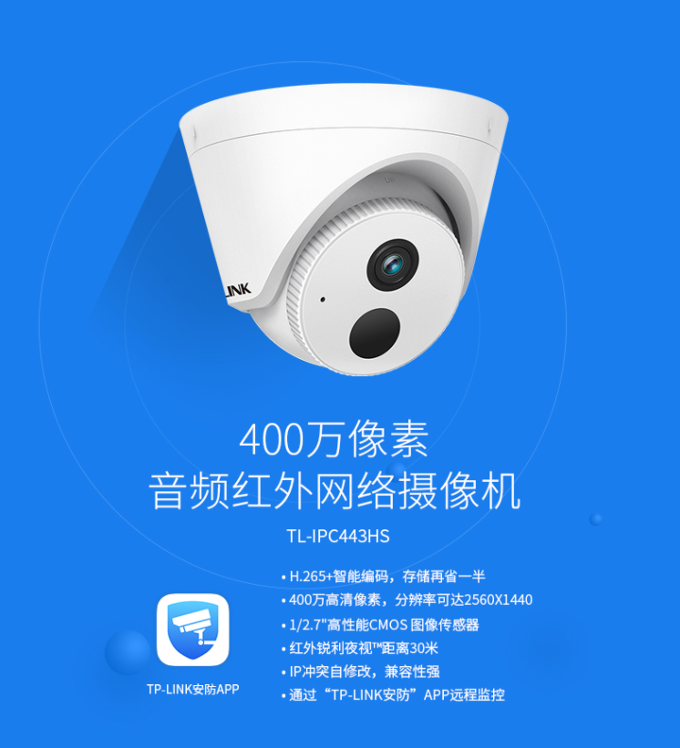 監(jiān)控?cái)z像機(jī)普聯(lián)/TP-LINK紅外音頻網(wǎng)絡(luò)攝像機(jī)400萬像素室外監(jiān)控器攝像頭TL-IPC443HS/臺